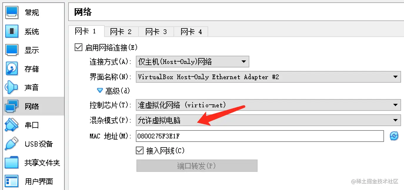 同时将网络选项的混杂模式选择:允许虚拟电脑,这个稍后链接虚拟机的时候会用到: