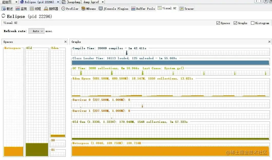 Visual GC 是常常使用的一个功能,可以明显的看到年轻代、老年代的内存变化,以及gc频率、gc的时间等。