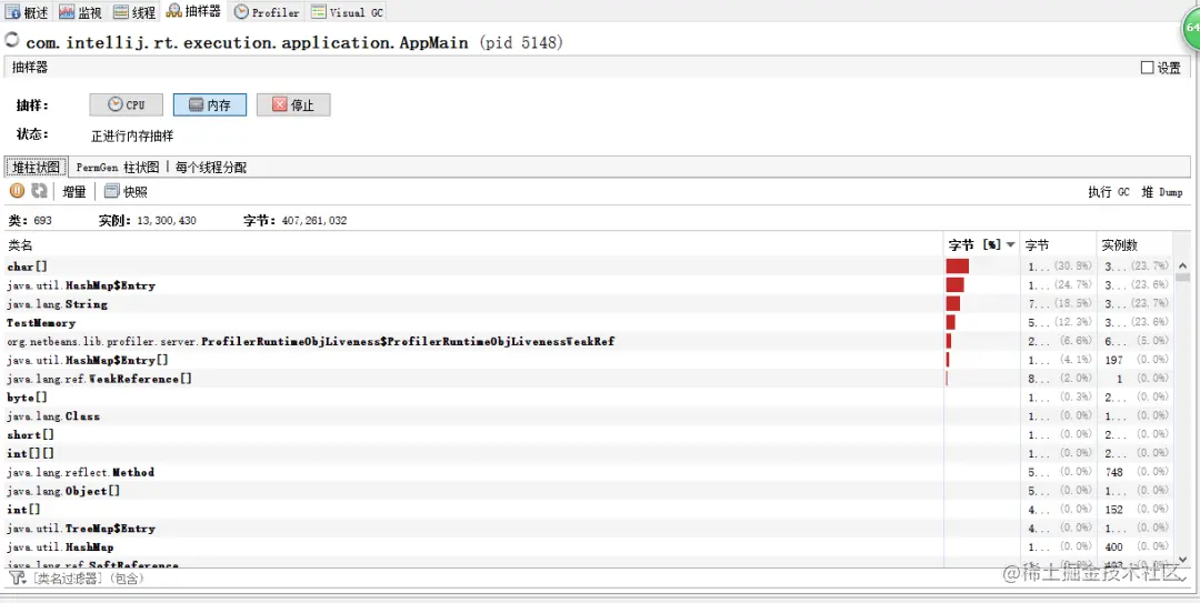 如何分析是那个对象泄漏了呢?打开抽样器标签:点击后如下图: