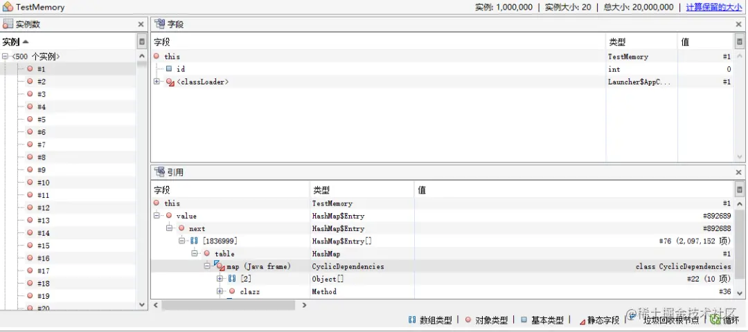 左侧是创建的实例总数,右侧上部为该实例的结构,下面为引用说明,从图中可以看出在类CyclicDependencies里面被引用了,并且被HashMap引用。