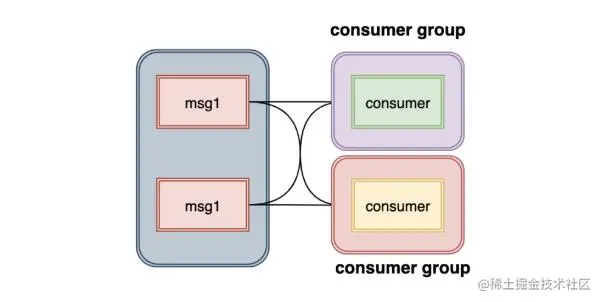 2.发布订阅:如果所有消费者属于不同的消费组,那么所有的消息都会被投递给每一个消费者,每个消费者都会收到该消息。