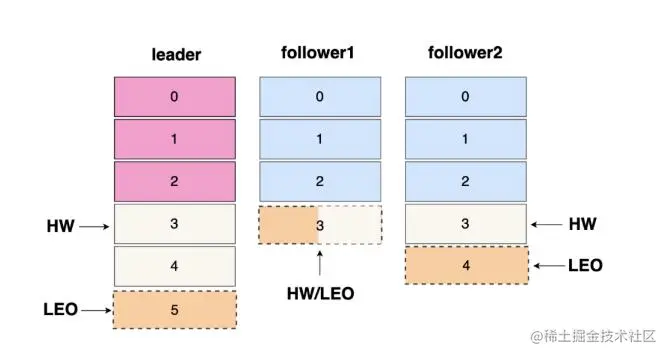如上图: 三个分区副本都是 ISR集合当中的,最小的 LEO 为 3,就代表分区的 HW 为3,所以当前分区只能消费到 0~2 之间的三条数据,如下图