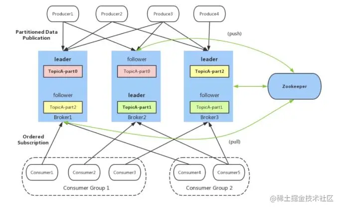 - Partition :为了实现扩展性,一个非常大的 topic 可以分布到多个 broker 上,一个 topic 可以分为多个 partition,每个 partition 是一个有序的队列。