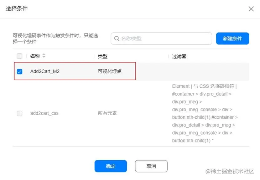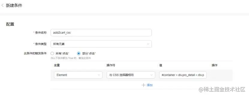 点击条件管理>新建,设置条件名称,条件类型选择“所有元素”,触发条件选择“部分点击”,变量选择“Element”,操作符选择“CSS选择器相符”,值设置为: