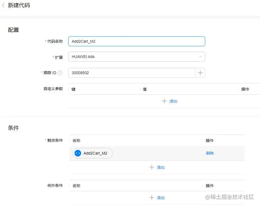 点击代码管理>新建,填写代码名称,扩展选择为“HUAWEI Ads”,跟踪ID设置为在HUAWEI Ads平台获取的转化ID,触发条件选择为上一步创建的可视化埋点。保存配置。