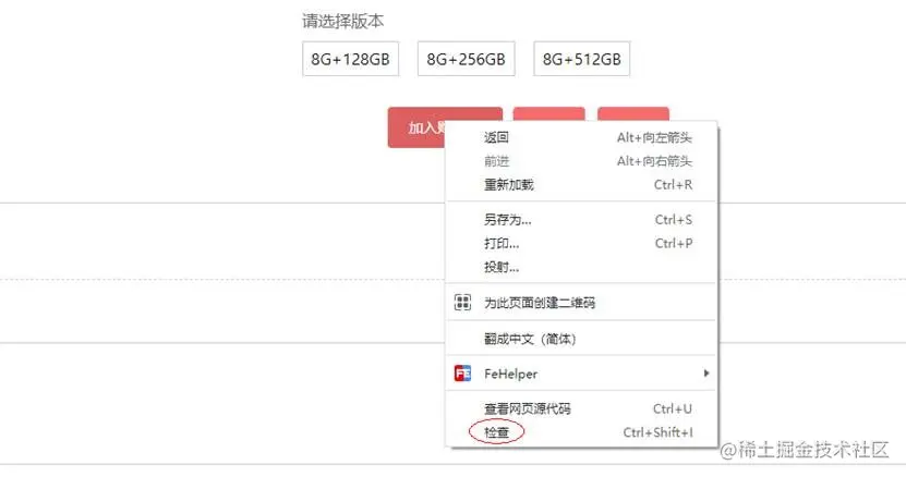 打开网页,在加入购物车按钮上右击,点击检查,找到加入购物车元素。