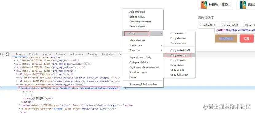 选中加入购物车按钮元素,右键选择 Copy > Copy selector ,将获取的值保存,后续配置DTM时需要使用。