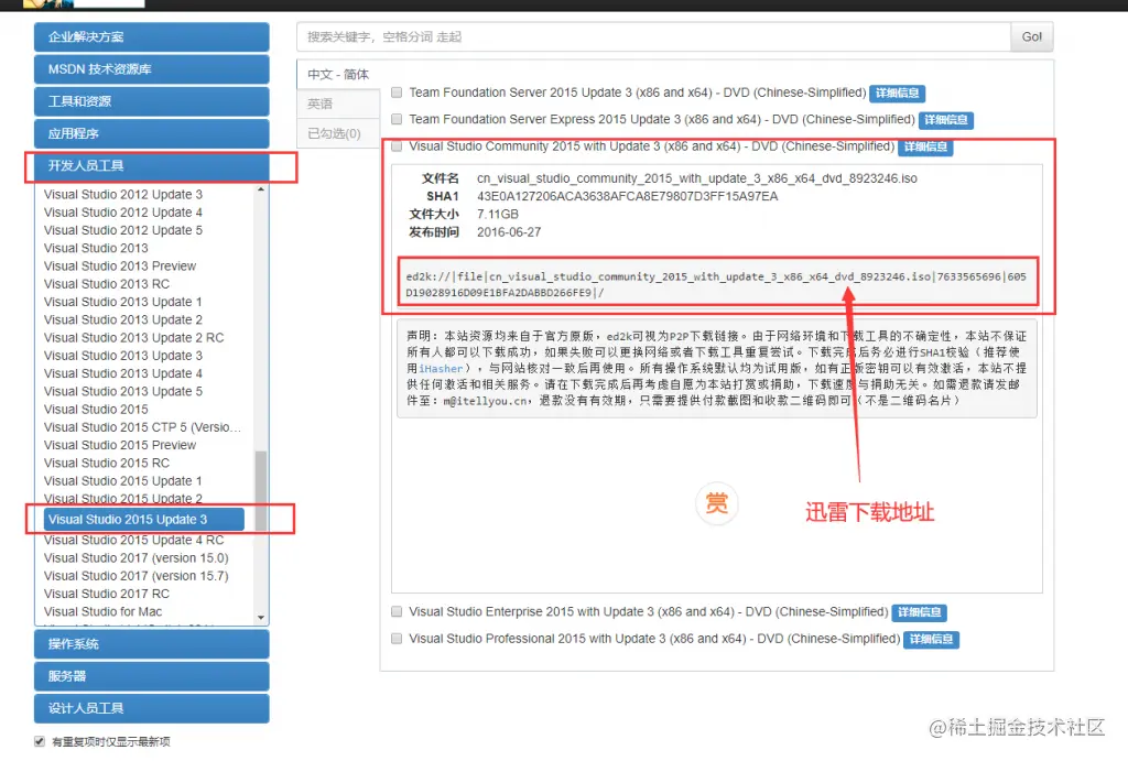 vs2015 英文下载地址:ed2k://|file|en_visual_studio_community_2015_with_update_3_x86_x64_dvd_8923300.iso|7617847296|AC962389EB54AF93431568804CB10875|/
