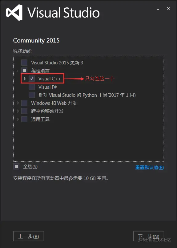 f.选择要安装的组件,只需要勾选 Visual C++ 即可,这样会节省很多空间,其他功能暂时我们也用不到!
