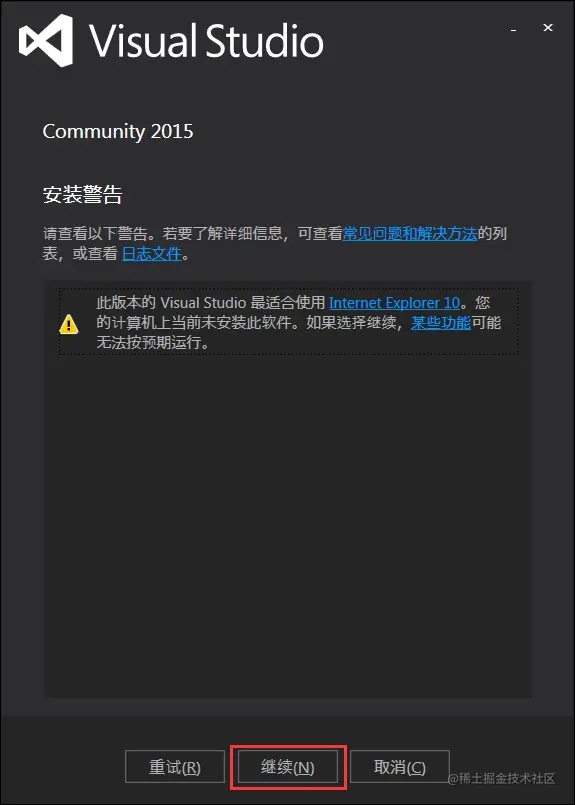 d.如果你的计算机配置不恰当,VS 安装程序会给出警告。出现该警告是由于我的电脑没有安装 IE10。忽略该警告,点击“继续”按钮。