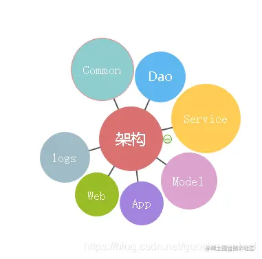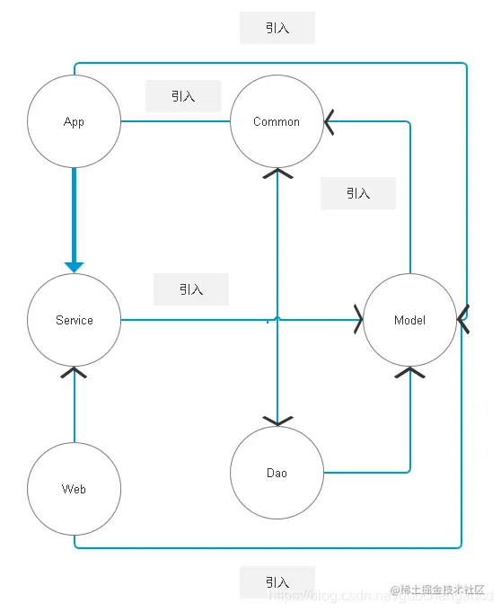 App(app请求接口全部在这里),Web(web请求接口全部在这里)、Dao(数据层)、Model(抽象数据层)、Service(业务层)、Common(所有通用工具在这里,任何模块接口访问)