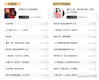 但内容的多元化并没有为喜马拉雅带来绝对优势。在其热播榜上,长期霸榜的多为网文有声书,其次是相声、评书等泛娱乐化内容。当然,娱乐化内容有利于获客,但喜马拉雅本身没有内容生产平台,在反垄断愈演愈烈的今天,连QQ音乐都丢失了周杰伦的独家版权,光靠授权的喜马拉雅很难以此形成自己的内容护城河。