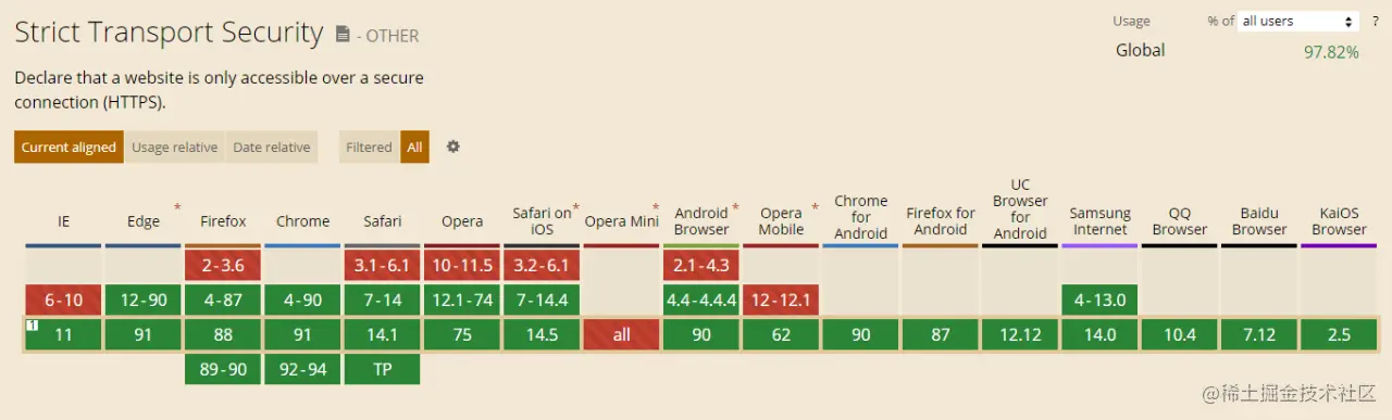 但是 HSTS 并不是随意开启的,它需要支持它的浏览器。目前市场上支持 HSTS 的浏览器如下:(对于那些不支持的浏览器,会忽略此响应头,对用户的访问无影响,可以不用担心)