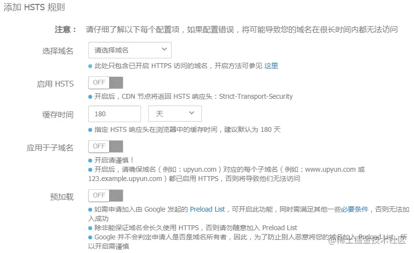 又拍云自 17 年起就已经支持配置 HSTS,配置步骤简单,操作方便。但是这里需要特别提醒的是,如果有参数设置不当可能会导致网站无法访问,大家如果遇到问题可以直接联系我们的客服小姐姐哦~