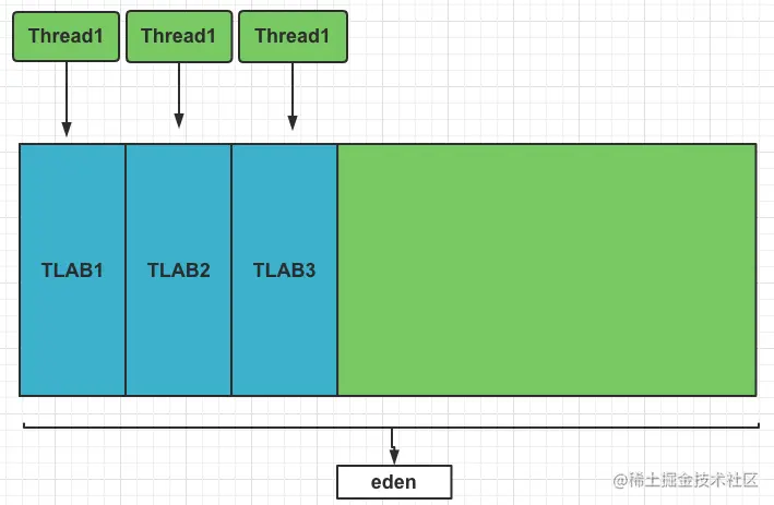 那么我们知道了对象分配首先是在eden区进行的,那么也不难理解上面的图,我们在eden区域划分出来一块区域,我们称之为TLAB,每一个TLAB都是现成私有的,那么并发创建对象的时候其实也就不需要进行加锁这样的操作了,这样现成安全问题就解决了。