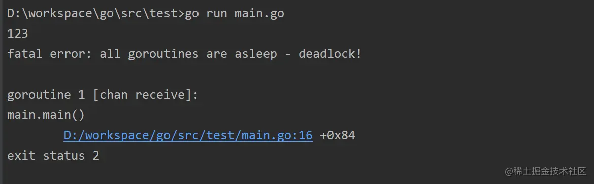这个例子里面,我在协程里面睡眠10秒,运行代码的时候发现,等了10秒打印123之后,然后报错deadlock(具体看下图):