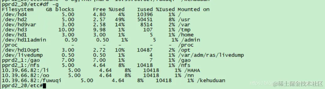 如果要安装的 NFS 在/etc/filesystems 中没有定义,就需要把在/etc/filesystems 中定义的安装选项在 mount 命令的参数中明确地指出来。例如要在本地主机(NFS客户端)安装远程主机(NFS服务器)上的目录,安装选项有∶后台安装(bg)、可中断的(intr)和硬安装(hard),那么可以使用下面的命令∶