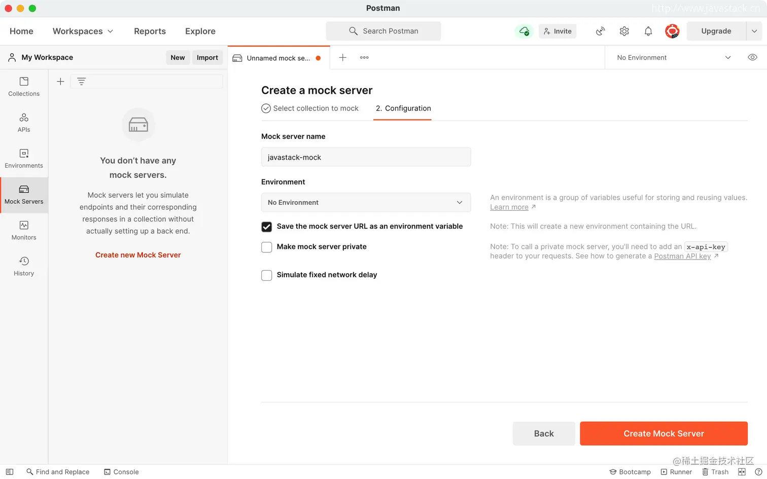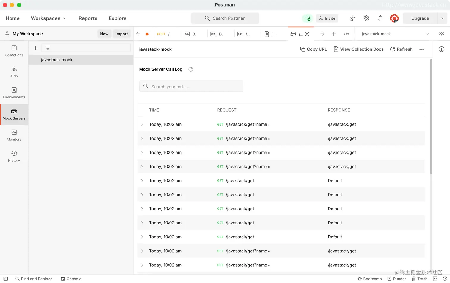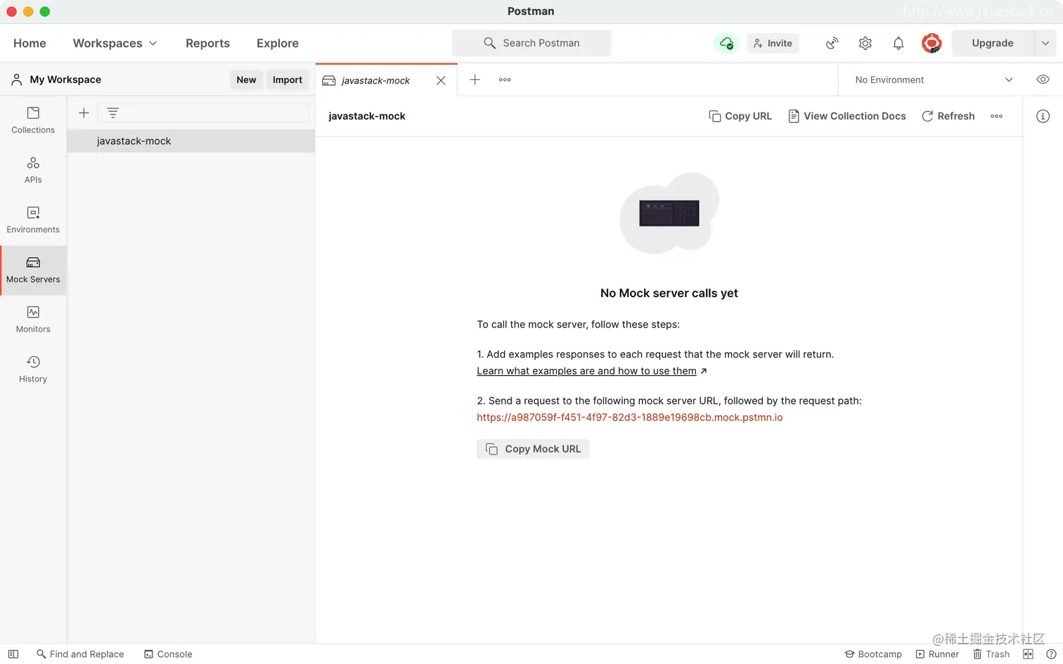 可以看到已经创建的 javastack-mock 集合,及之前创建的两个请求及默认示例响应,以及创建的 Mock Server Url 环境变量。