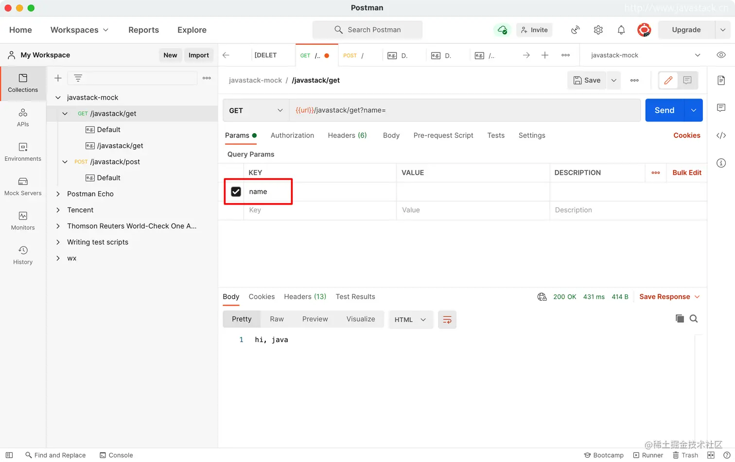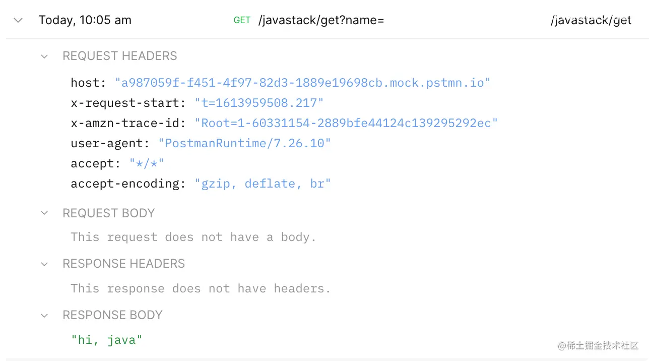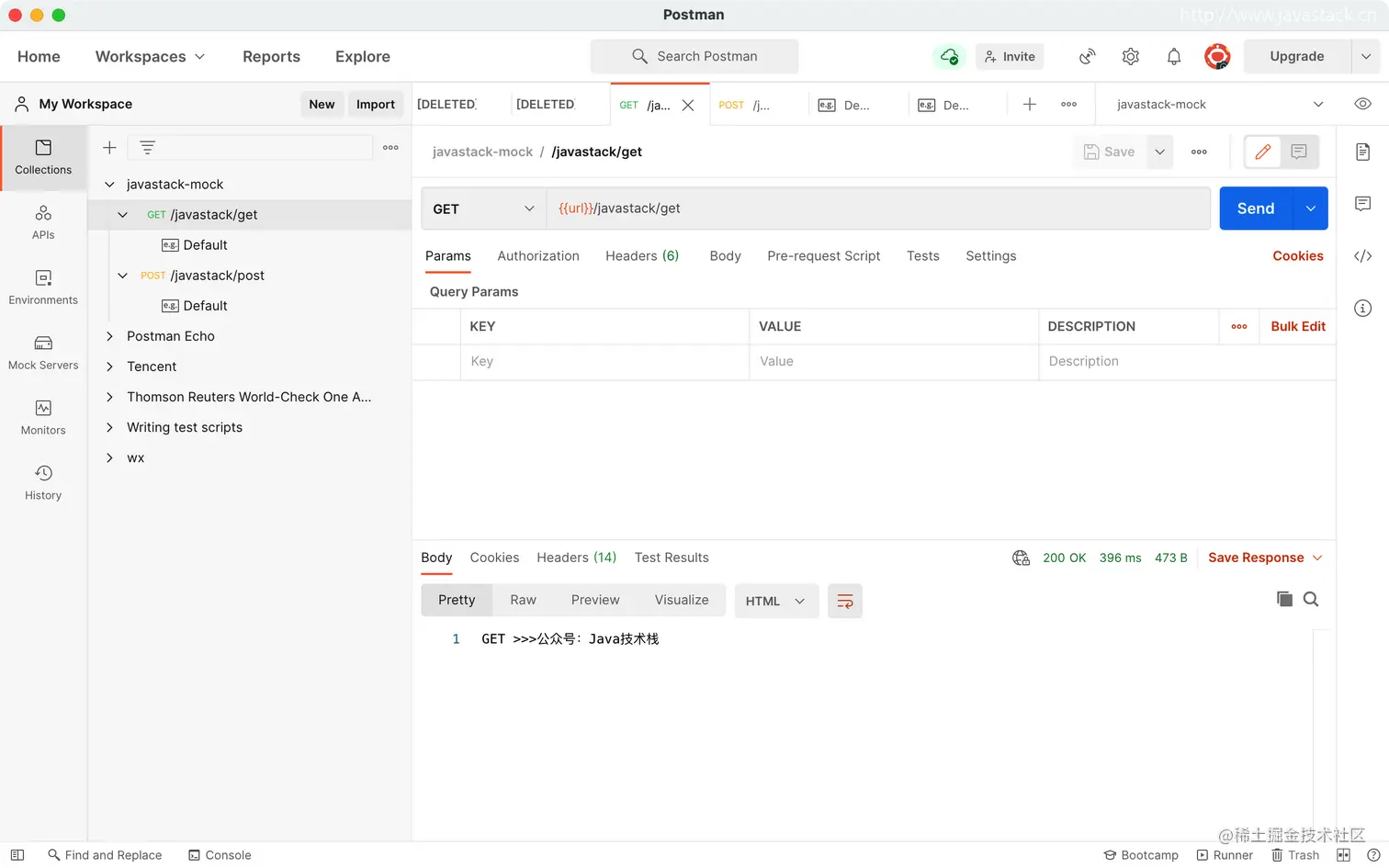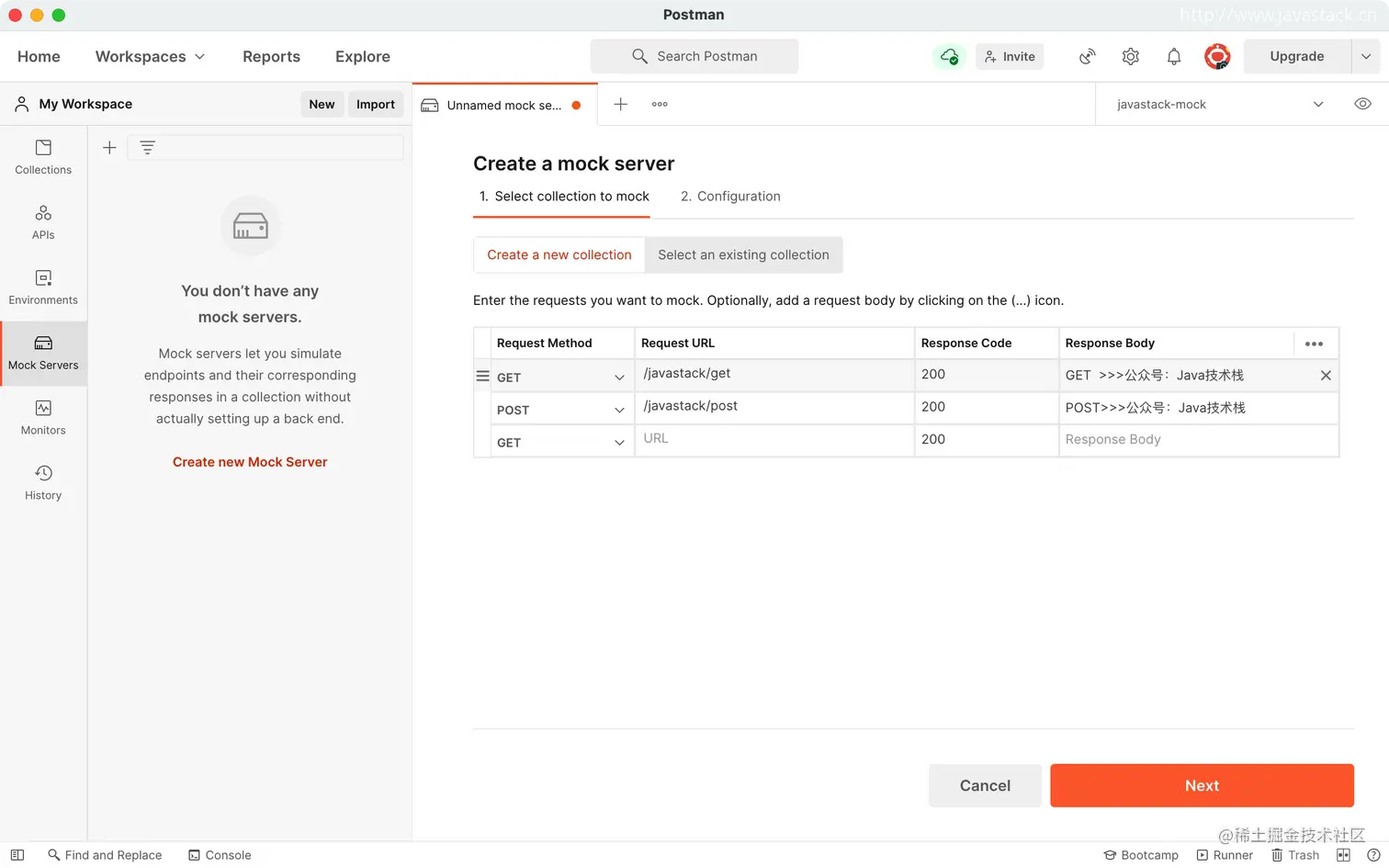 可以看到已经创建的 javastack-mock 集合,及之前创建的两个请求及默认示例响应,以及创建的 Mock Server Url 环境变量。
