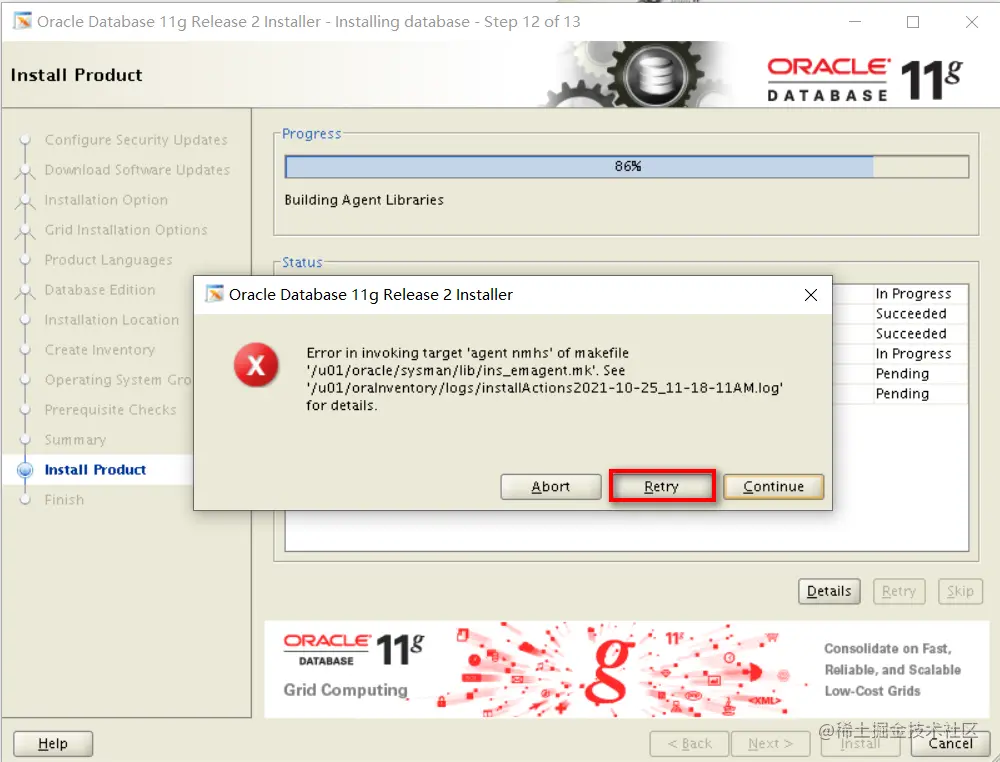 Oracle数据库在安装至86%时,可能报错Error in invoking target 'agent nmhs' of makefile