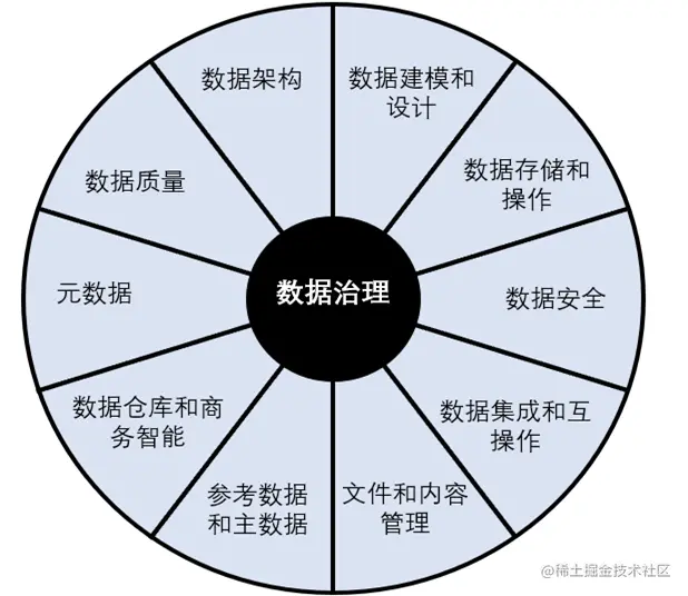 其实数据治理的范围很⼴,包含数据本⾝的管理、数据安全、数据质量、数据成本等。在DAMA 数据管理知识体系指南中,数据治理位于数据管理“车轮图”的正中央,是数据架构、数据建模、数据存储、数据安全、数据质量、元数据管理、主数据管理等10大数据管理领域的总纲,为各项数据管理活动提供总体指导策略。