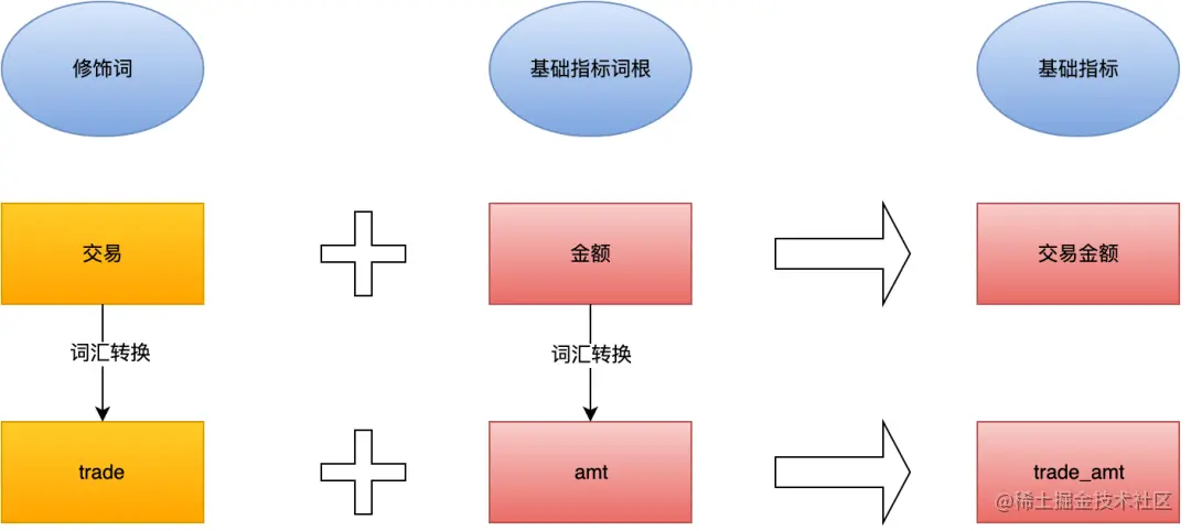 5.基础指标,单一的业务修饰词+基础指标词根构建基础指标 ,例如:交易金额-trade_amt。