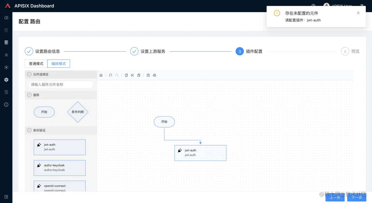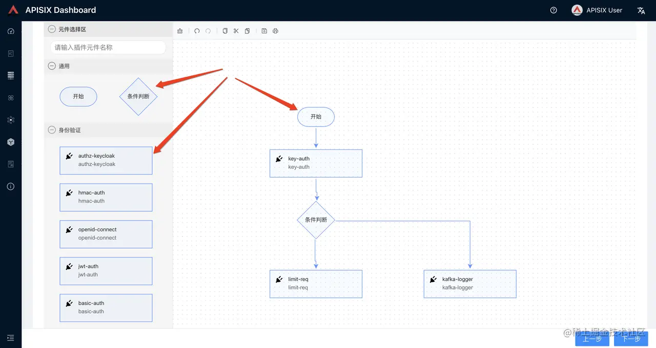 在编排实现过程中,我们抽象出了通用元件与插件元件的概念:通用元件是指开始节点、结束节点与条件判断节点,插件元件则是每一个可用的 Apache APISIX 插件,通过将这些元件拖拽到画板中来完成插件编排的流程。如图所示: