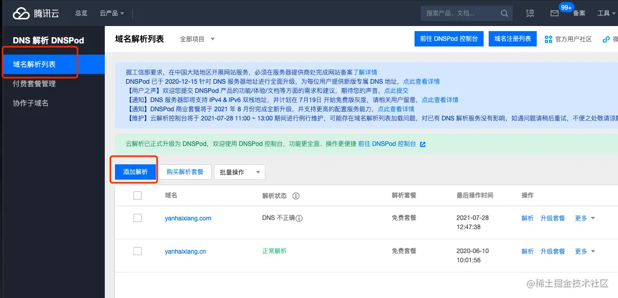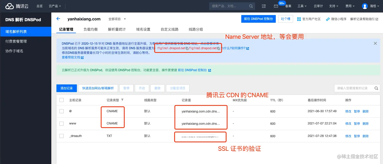之前我也是使用腾讯云的 DNS Pod 作为 DNS 服务器的,只是昨天写文章的时候换成了 NameSilo 的,想着也不会有问题,结果出了大问题。