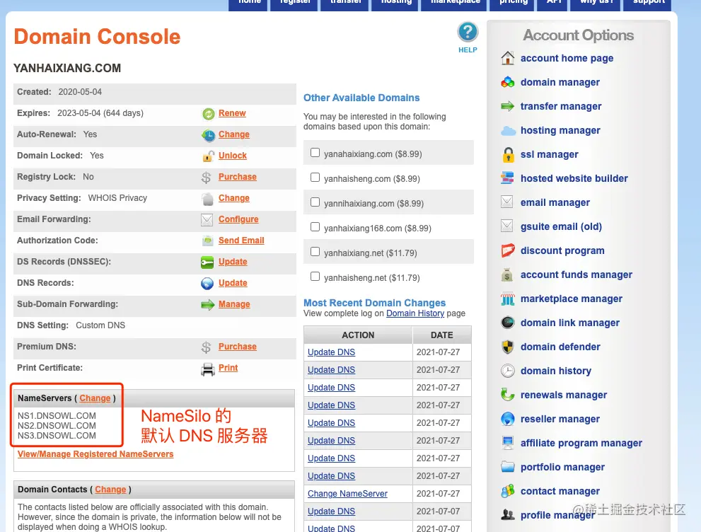 重新打开 NameSilo,点击你的域名,会看到 NameServers 这里有 3 个默认 DNS 服务器的地址。