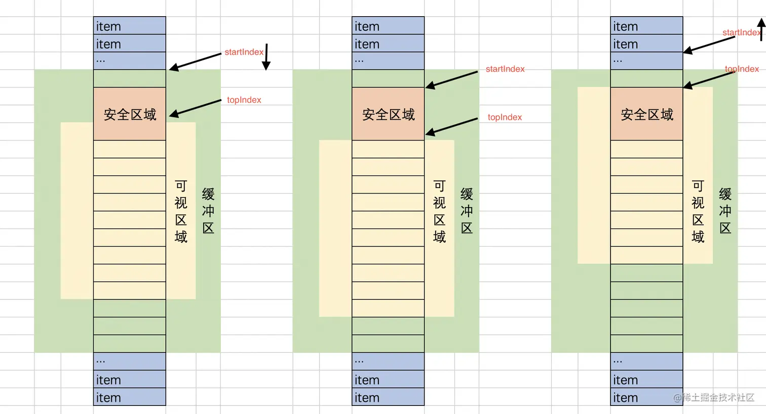 - 其实2和3的情况不需要做区分,只需要在出了安全区域之后,移动startIndex,让topIndex落到安全区域即可,那就放在缓冲区域的最中间吧,这样算法就简单了, topIndex = startIndex + cacheSize/2。