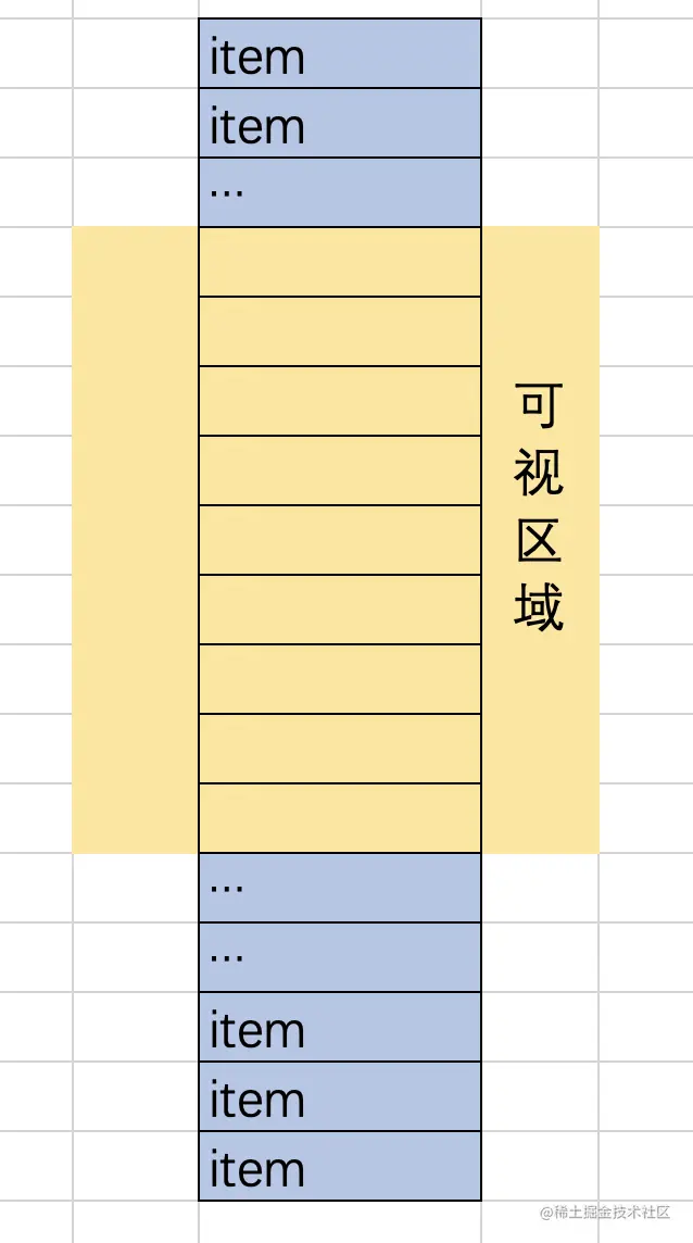 虽然列表很长,但是大部分区域是看不到,所以只需要渲染可视区域的元素就可以了,用户在滑动的时候更新渲染的数据即可。