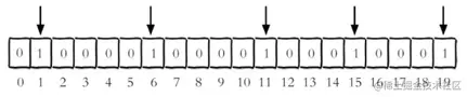 设置键的第offset个位的值(从0算起) , 假设现在有20个用户,userid=1, 6, 11, 15, 19的用户对网站进行了访问, 那么当前Bitmaps初始化结果如图: