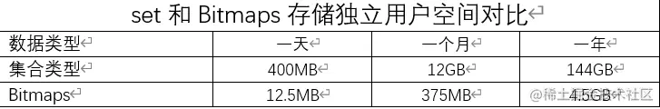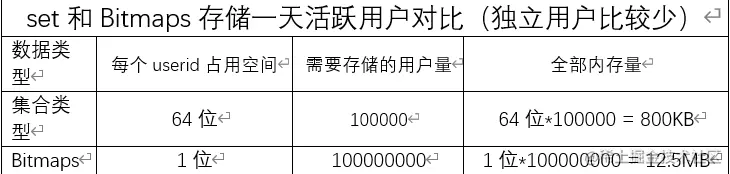 但Bitmaps并不是万金油, 假如该网站每天的独立访问用户很少, 例如只有10万(大量的僵尸用户) , 那么两者的对比如下表所示, 很显然, 这时候使用Bitmaps就不太合适了, 因为基本上大部分位都是0。