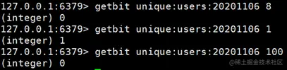 获取id=8的用户是否在2020-11-06这天访问过, 返回0说明没有访问过: