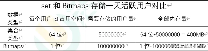 假设网站有1亿用户, 每天独立访问的用户有5千万, 如果每天用集合类型和Bitmaps分别存储活跃用户可以得到表