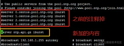 主节点加入: server ntp.api.gz iburst 从节点加入: server 192.168.99.57 iburst 添加完成所有节点执行: systemctl start ntpd systemctl enable ntpd