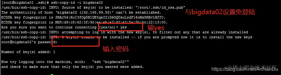cd ~/.ssh/ cp id_rsa.pub authorized_keys # 下面的命令是把其他主机的公钥复制到本机 ssh-copy-id -i bigdata01 ssh-copy-id -i bigdata02 ssh-copy-id -i bigdata03所有节点互相配置,自身不需配置,最后ssh其他节点直接进去则成功