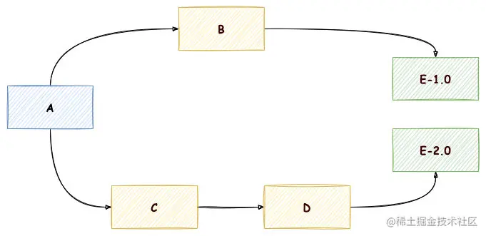 如上所示,如果 A 应用 使用了 E2.0 新增某些类或者方法,那这个时候由于依赖冲突,A 实际上间接依赖的是 E1.0,这就导致 IDEA 编译的时候找不到 E 新增这些类或方法。