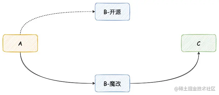A 应用依赖 B ,那 B 是一个开源项目,但是公司内部对 B 进行一些修改。修改之后, B 依赖 C ,所以 A 中使用 C 依赖某些类。