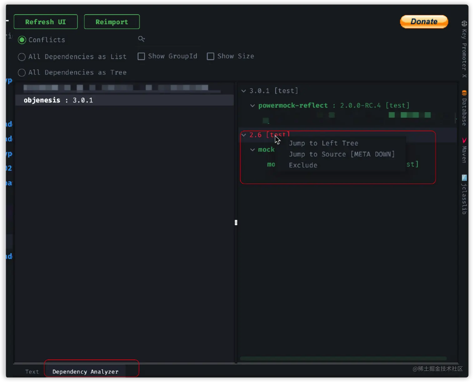 选中其中一个依赖包,就可以在右侧看到所有冲突依赖包的版本。选中其中一个版本,右键选中 Exclude 即可。