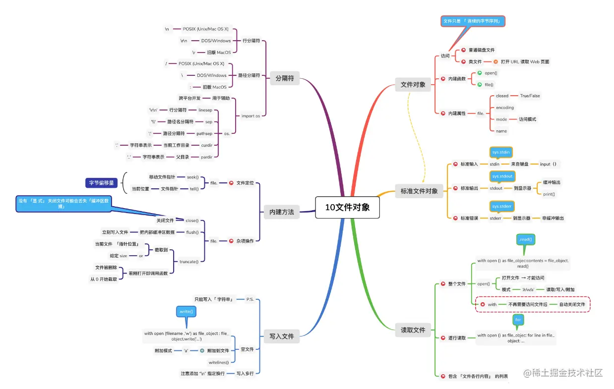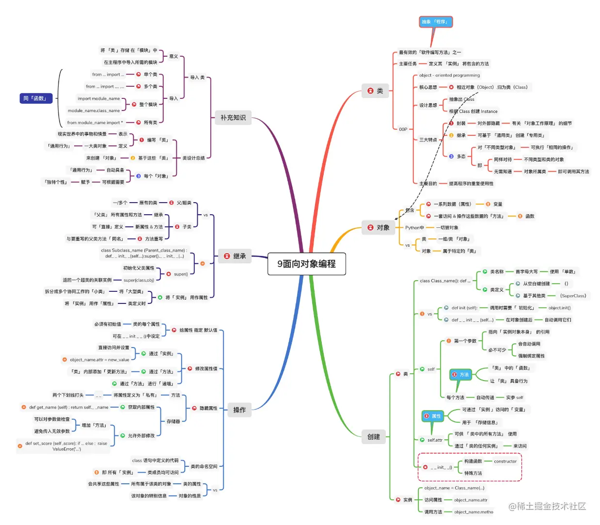 - 按顺序依次展示了以下内容的一系列思维导图:基础知识,数据类型(数字,字符串,列表,元组,字典,集合),条件&循环,文件对象,错误&异常,函数,模块,面向对象编程;