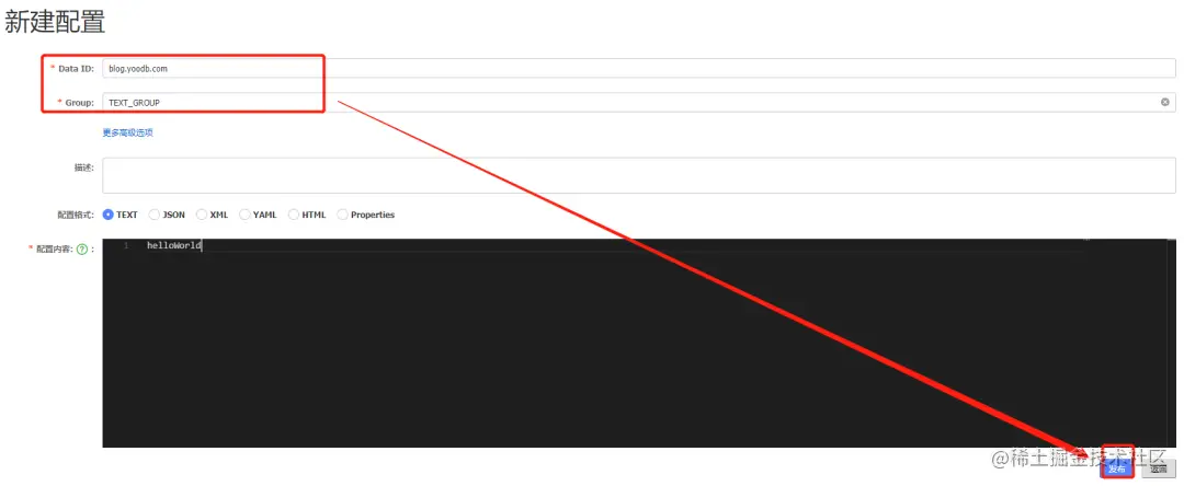 curl -X POST "http://127.0.0.1:8848/nacos/v1/cs/configs?dataId=blog.yoodb.com&group=TEXT_GROUP&content=helloWorld"