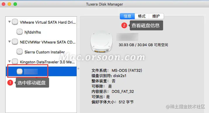 在Tuxera Disk Manager界面左侧磁盘栏内,根据磁盘名称找到移动磁盘,单击选中该磁盘便可于右侧“信息”区域查看磁盘基本信息。