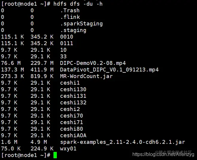 hdfs dfs -du -h 输出三列数据的含义 Allenzyg 2021-07-29 292 阅读1分钟 第一列:该目录下总文件大小 第二列:该目录下所有文件在集群上的总存储大小和你的副本数相关,我的副本数是3 ,所以第二列的值是第一列的三倍 (第二列内容=文件大小*副本数) 第三列:你查询的目录
