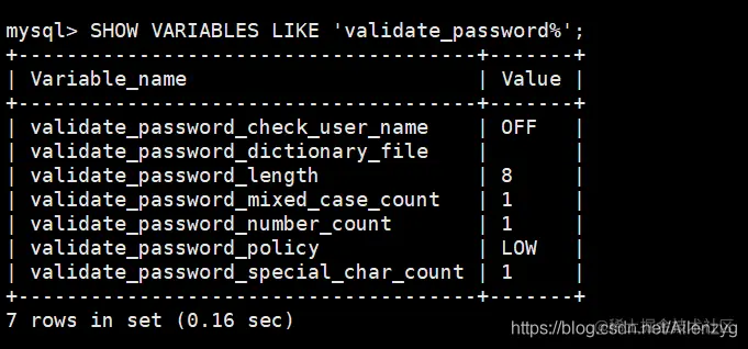 密码的长度是由validate_password_length决定的, validate_password_policy决定密码的验证策略,默认等级为MEDIUM(中等),可通过以下命令修改为LOW(低)