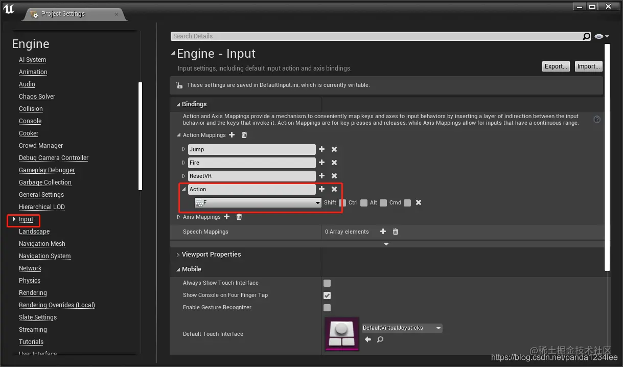 接下来,和上一节类似,让我们向项目添加一个 Action 输入。在本例中,我们将把 Action 输入绑定到键盘的 F键。转到 编辑>项目设置 ( Edit > Project Settings)。然后选择 Input 选项。单击 Action Mappings 旁边的加号。调用新的输入 Action 并从下拉菜单中选择 F 。