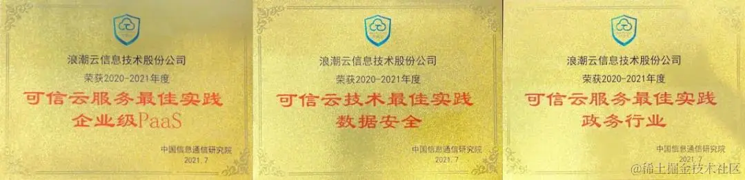 大会期间,可信云各项评估认证及奖项结果陆续公布,经过层层审核评选,浪潮云通过混合云安全能力、容器平台安全能力、面向金融场景的大规模容器平台性能、堡垒机安全评估四项权威认证,并荣获可信云技术最佳实践-安全类-数据安全、服务最佳实践-企业级PaaS、政务行业最佳实践三大奖项,同时作为首批参与单位出席云原生性能实验室、零信任标准推进和测评实验室成立仪式。