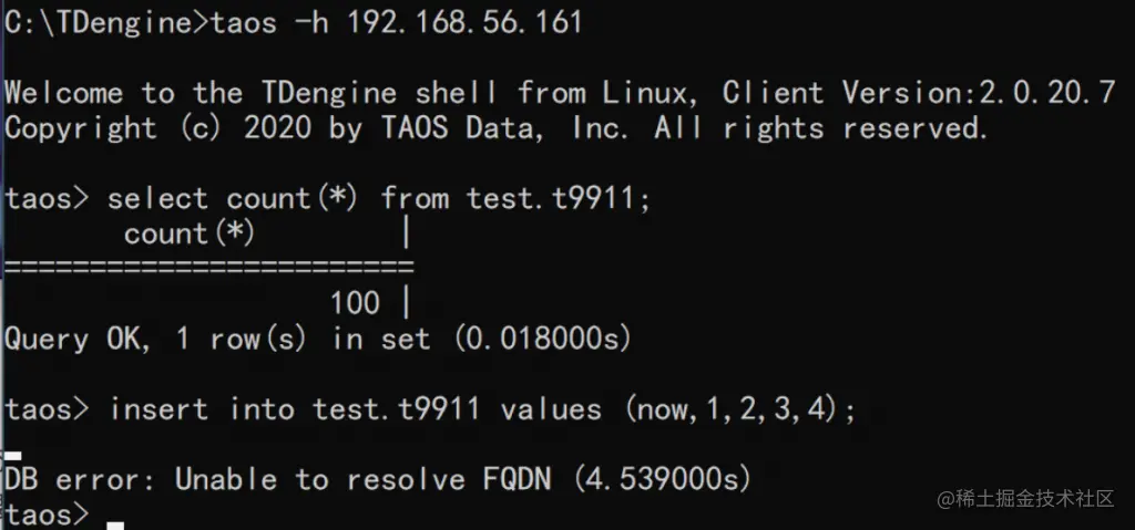 出现场景1的原因是——在这个客户端的hosts文件(或者DNS服务)中,没有写TD1。上图中,客户端用taos -h 192.168.56.161连接到TDengine服务端,取回TD1作为通讯地址。当执行查询的时候,TDengine试图把TD1解析成ip却发现TD1并不在其中——这就是Unable to resolve FQDN。