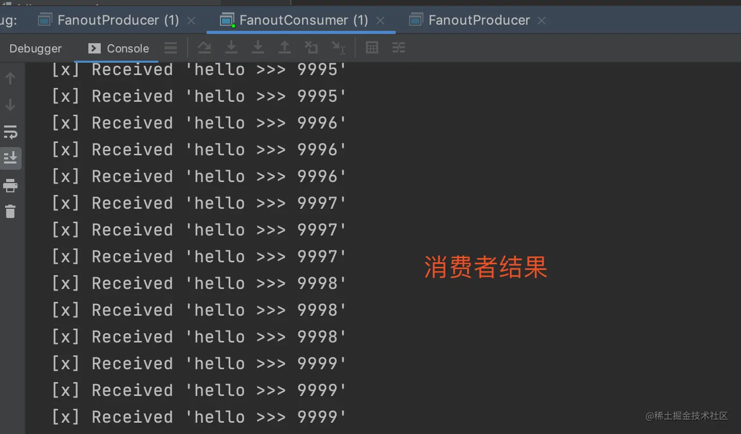 我们发现,生产者生产的10条数据,在每个消费者中都可以消费,这个是和Direct不同的地方,但是使用Fanout方式时,有几个点需要注意一下: