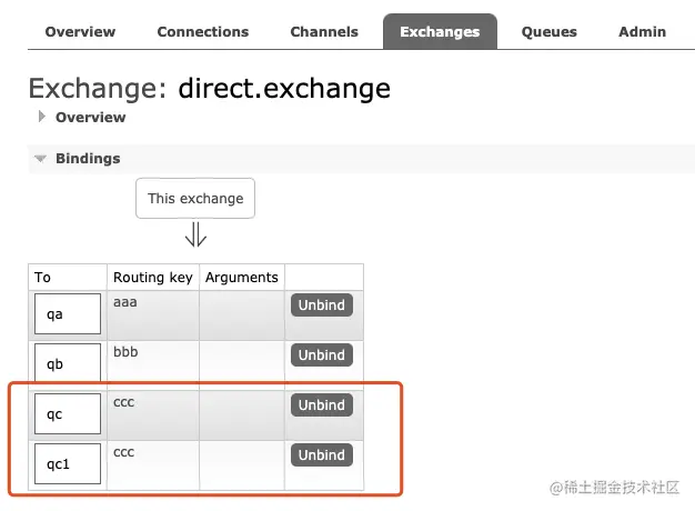 当我们把队列中的数据全部消费掉,然后重新执行生成者后,会发现qc和qc1中都有3条待消费的数据,因为绑定的key都是“ccc”,所以两者的数据是一样的:
